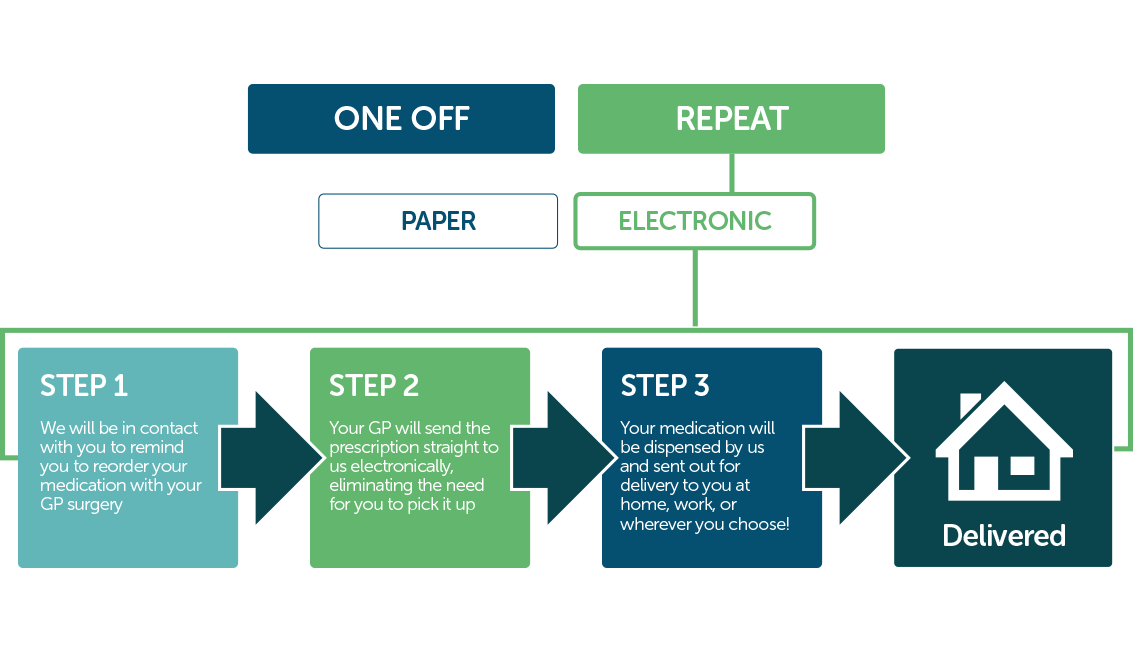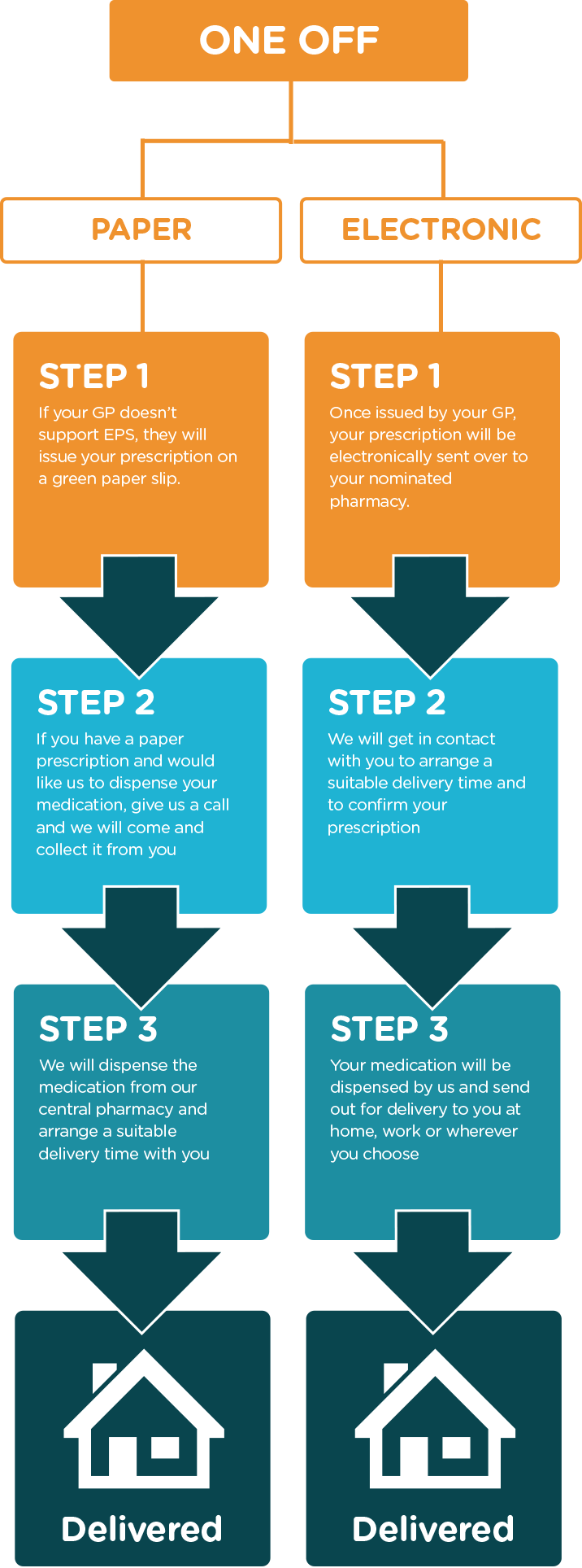 At Harrogate Pharmacy, we can help you with whichever prescription you have. The following diagram shows how Harrogate Pharmacy will process your prescription, however your doctor chooses to prescribe it.